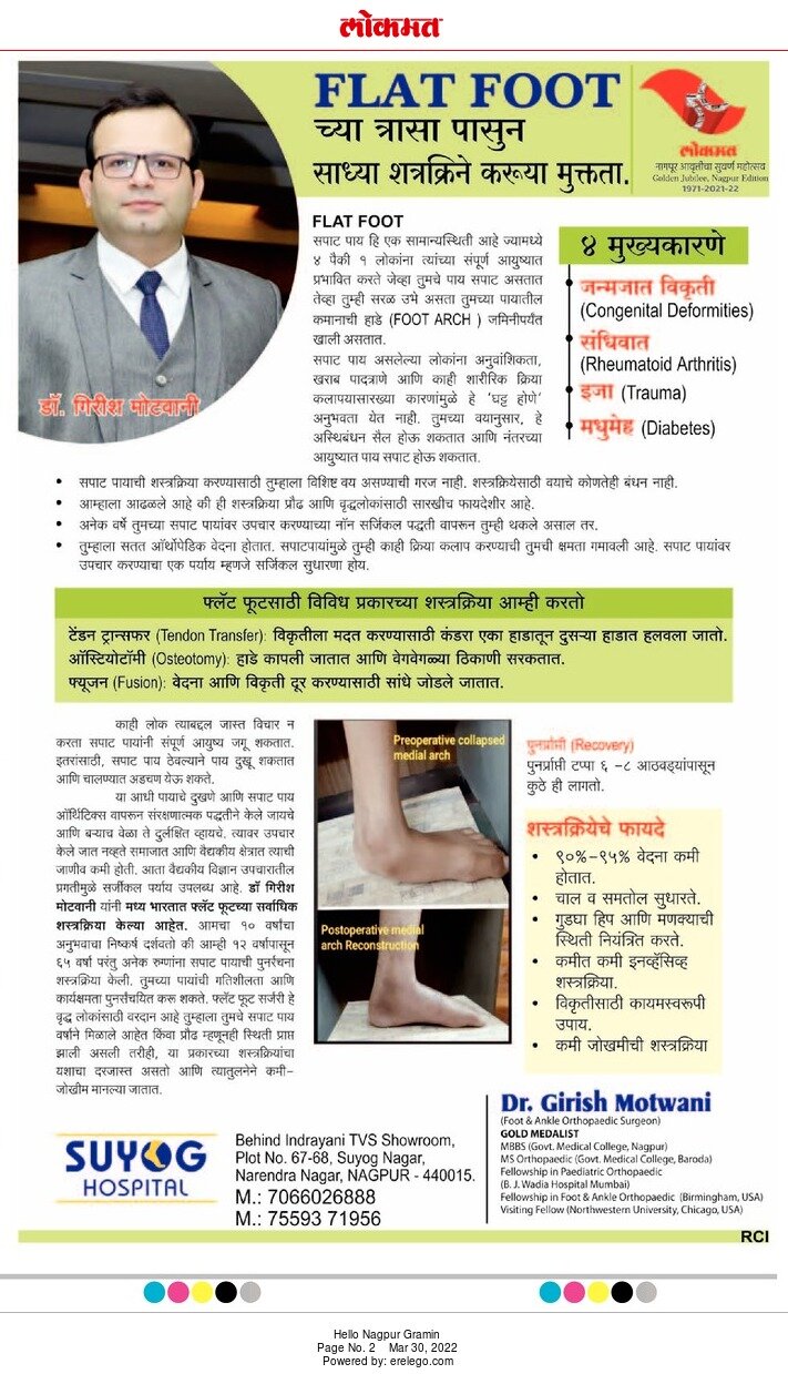Flat foot treatment - Dr. Girish Motwani A person with flat feet has no visible arch in the foot when they stand. All babies have flat feet. Arches form during early childhood. If arches d...